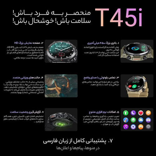 ساعت هوشمند T45i، محصولی است که توانسته با ترکیب ظاهر زیبا و مدرن و همچنین ویژگیهای پیشرفته، تجربهای کاربردی و لذتبخش را برای کاربران فراهم آورد. این ساعت هوشمند با بدنه فلزی سبک و ضخامت کم خود، علاوه بر داشتن ظاهری اسپرت و جذاب، احساس راحتی و آسایش را در هنگام استفاده به شما خواهد داد. همچنین، مقاومت در برابر آب و گرد و غبار این محصول اجازه میدهد تا به راحتی از آن در تمام فعالیتهای روزمره خود استفاده کنید. از سوی دیگر، صفحهنمایش با کیفیت بالا و قابلیت لمسی ساعت هوشمند T45i، کنترل آسان و سریع ویژگیها و برنامههای مختلف را میسر میسازد. این ویژگی بههمراه پشتیبانی از تکنولوژیهای ارتباطی پیشرفته مانند بلوتوث و Wi-Fi، امکان برقراری ارتباط مستقیم و بیواسطه با گوشی همراه شما را فراهم میآورد. همچنین، وجود طیف گستردهای از سنسورهای پیشرفته در این ساعت هوشمند، امکان ردیابی دقیق فعالیتهای ورزشی و وضعیت سلامت شما را فراهم میکند. با استفاده از این قابلیتها، میتوانید بهطور مستمر از روند پیشرفت و وضعیت فعلی خود مطلع شده و برنامهریزی مناسبی برای فعالیتهای بدنی داشته باشید. در نهایت، قیمت مناسب و ارزش خرید بالای ساعت هوشمند T45i به همراه خدمات پسازفروش مطمئن برند سازنده، شرایط ایدهآلی را برای خرید این محصول فراهم میآورد.